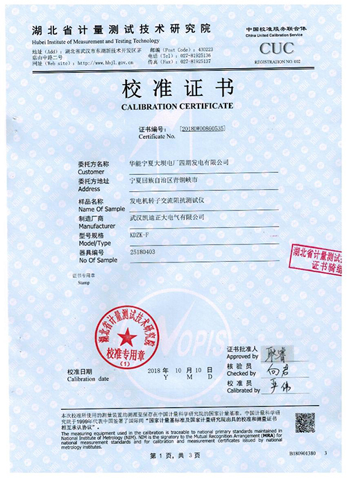 武漢凱迪正大KDZK-F發(fā)電機(jī)轉(zhuǎn)子交流阻抗測試儀校驗(yàn)證書